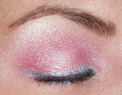 - Prestige Eyeshadow Single in Love (shimmery medium pink): outer corner of lid, blended into crease.